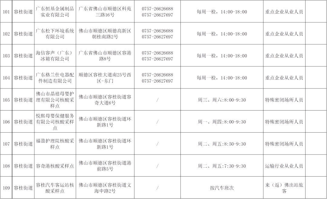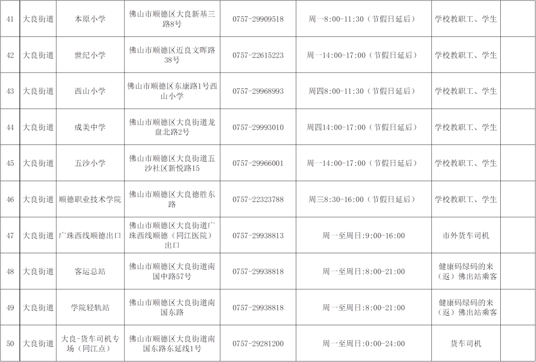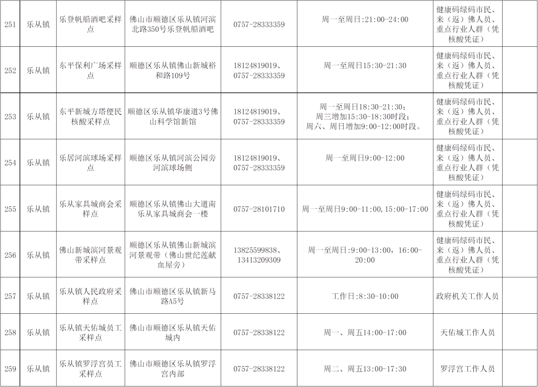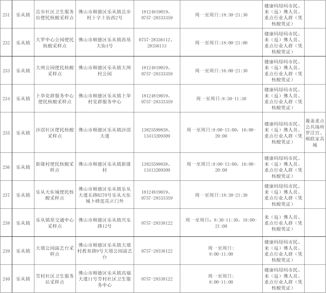 顺德区在10个镇(街道)共设置327个便民核酸采样点,服务对象覆盖来(返)佛人员、健康码为黄码人员、重点人群及其他有自费核酸检测需求人员。