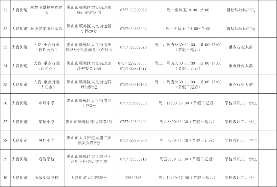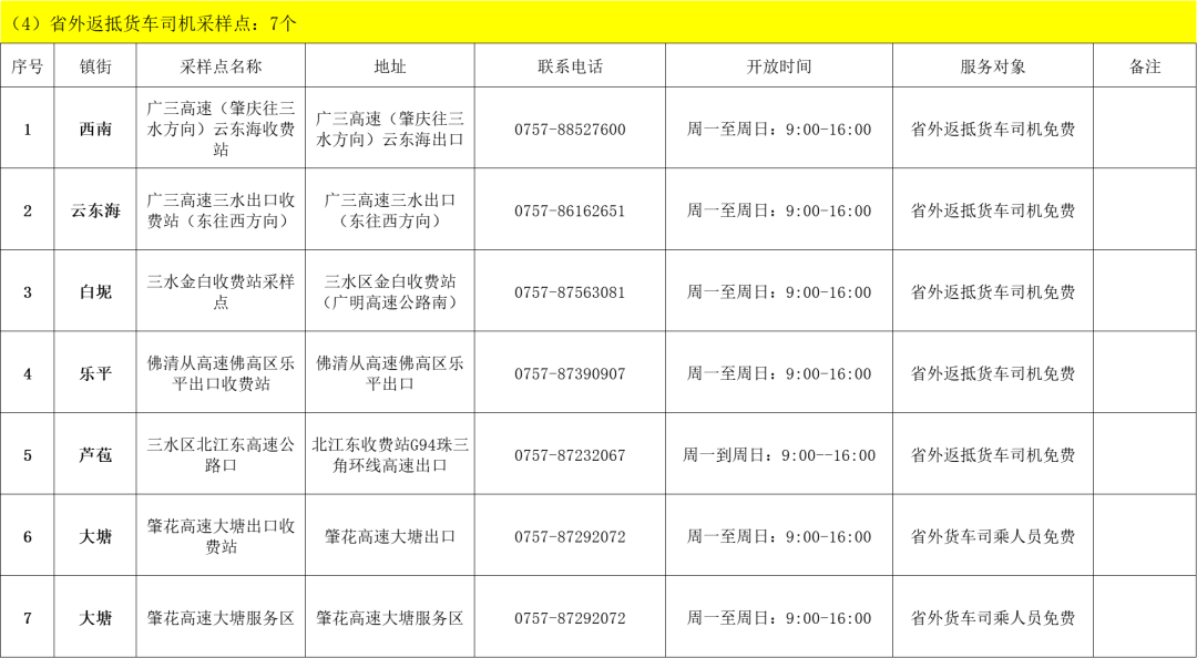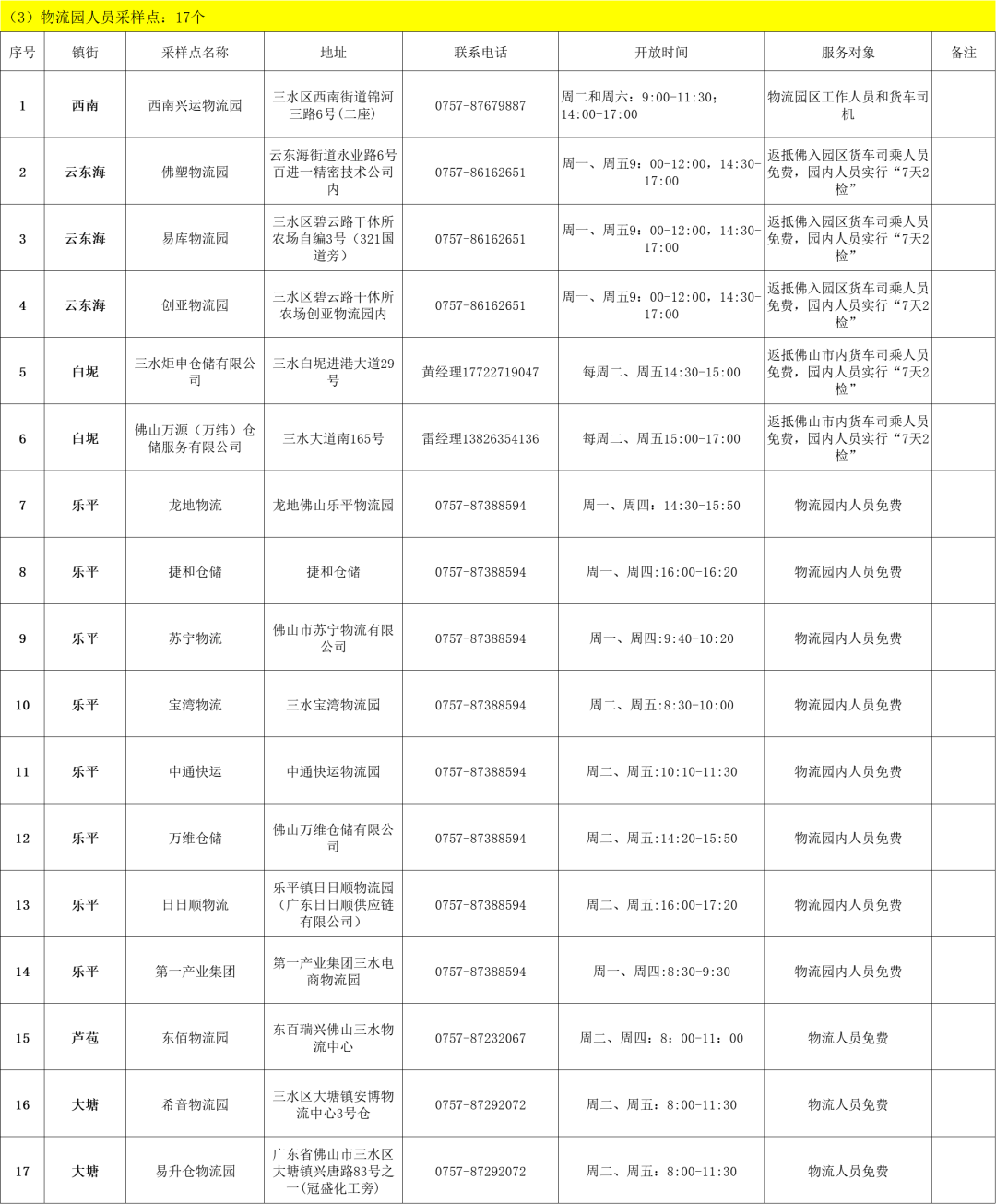 9月30日、10月6-7日,佛山市中医院三水医院、三水区妇幼保健院、三水区白坭镇人民医院、三水岭越医院、大塘镇卫生院、南山镇卫生院及西南街道山水一品采样点均延长服务时间至21时。