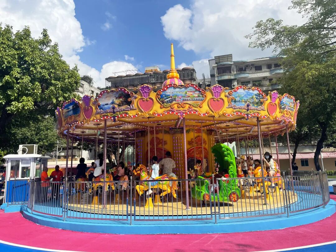 家长带小朋友玩旋转木马,共度美好的亲子时光。