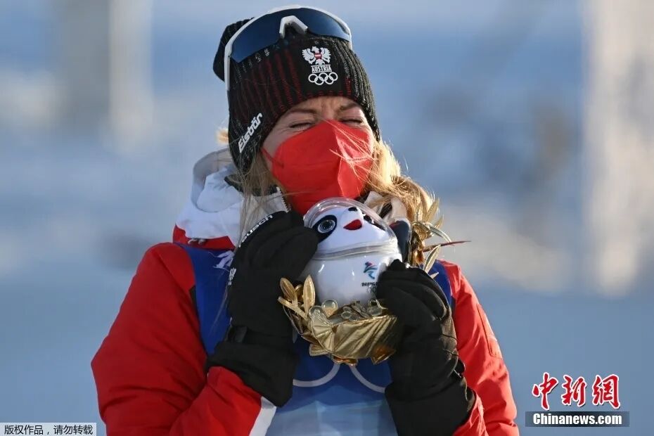 图为收获亚军的奥地利选手将冰墩墩抱入怀中。