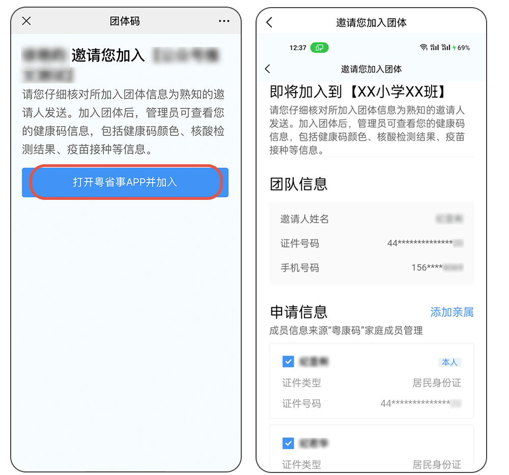 如学校要求学生共同居住人加入班级团体,家长可转发二维码或链接给对应亲属,或直接在“加入班级团体页面”页面点击“添加亲属”,填写亲属信息并通过人脸识别验证后,添加家庭成员。若之前已在粤康码家庭成员管理中添加过该成员,其信息则会自动同步至申请成员列表中。