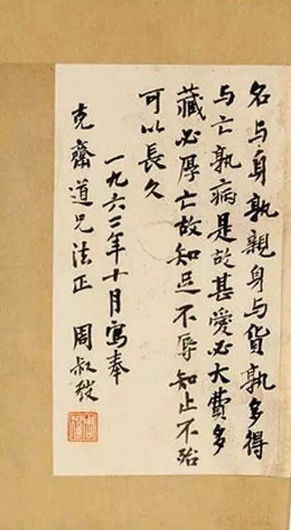 周叔弢应瓮克斋邀请,写老子《道德经》中的处世箴言相赠。全文(原件无标点)为:“名与身孰亲?身与货孰多?得与亡孰病?是故甚爱必大费,多藏必厚亡。故知足不辱,知止不殆,可以长久。一九六二年十月写奉克斋道兄法正,周叔弢。”