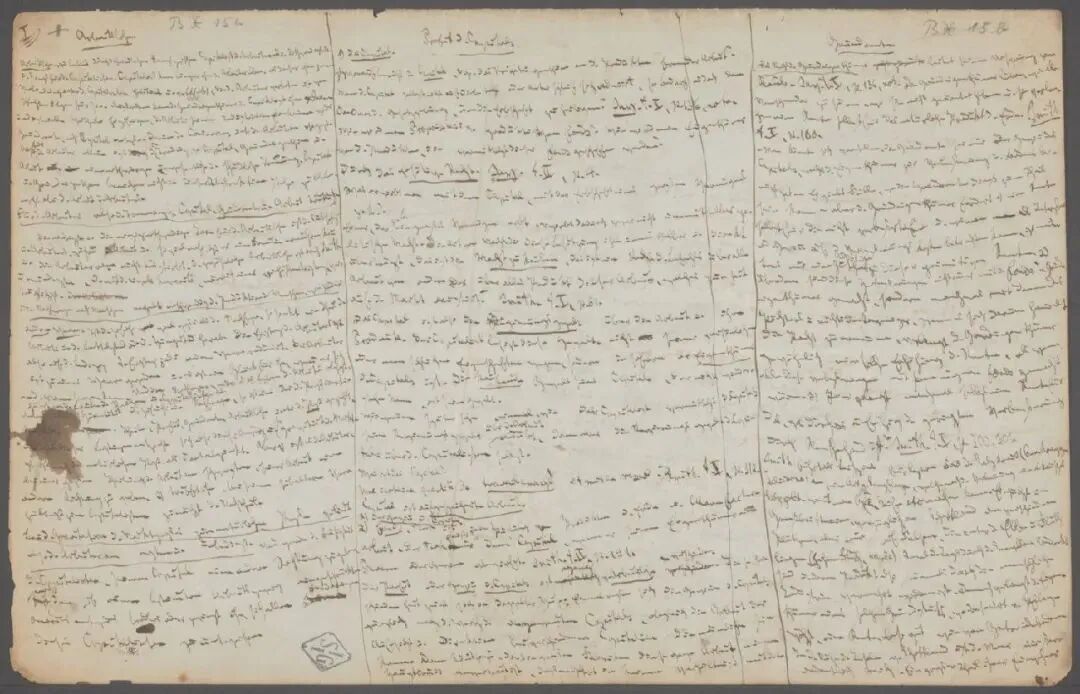 这份手稿是马克思早期以国民经济学理论为批判研究对象的笔记,讲到了对私有财产的扬弃和资本主义的异化劳动。这部笔记在装帧上极富特色,马克思以分栏的方式书写,全部写完之后由外向里包上手稿装订,所以前部会有7个空白页,而且开篇第一段文字实际是手稿第17页的内容。