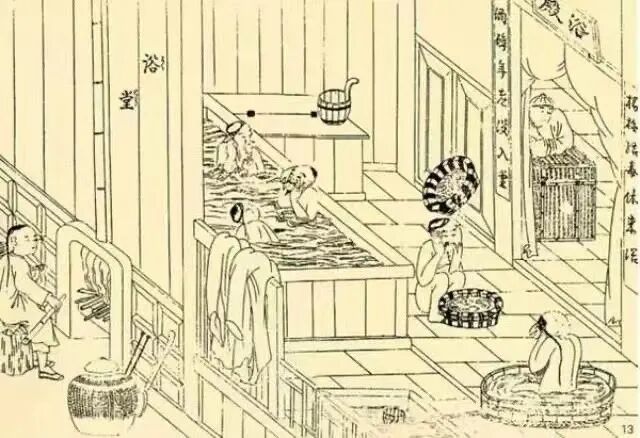 客人衣服都挂在高处,不像现在贮衣柜,一开全是臭汗味,甚至有虱子、臭虫。池子中,浴盆每天用盐粒砂子碱水洗得光可鉴人,白瓷砖像水晶宫。大门口照例有二掌柜穿着银灰或月白短裤褂接待客人,一进门满面堆笑,熟人三爷、二爷、张先生、李先生分外亲热;生人也格外招呼里面看座,由门口一直喊到后堂。至于洗完倒茶、送毛巾,替你擦背,更是接二连三,你只能张手说够啦、不要啦——这样的服务小费您还会不给吗?当然也不会多,一般毛儿八分而已。而且您真要不给,笑脸绝不会改,不是还有下回吗?这热情是真心的。