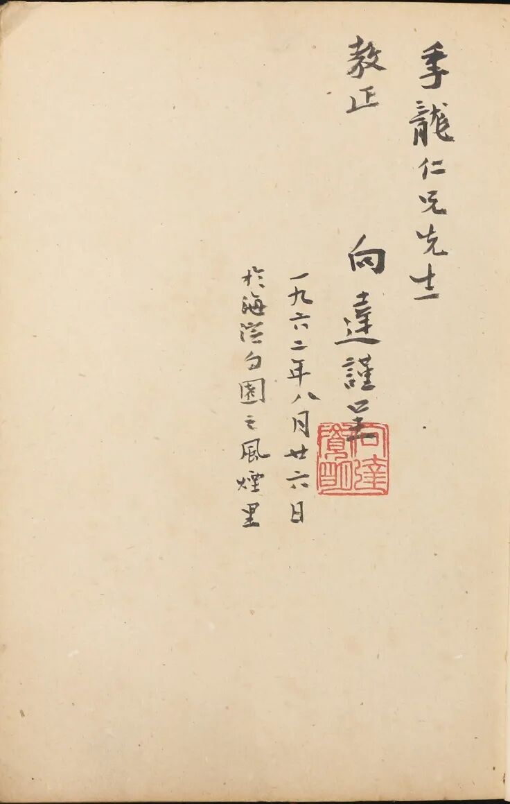有向达题写“季龙仁兄先生教正,向达谨呈,一九六二年八月廿六日于海淀勺园之风烟里”