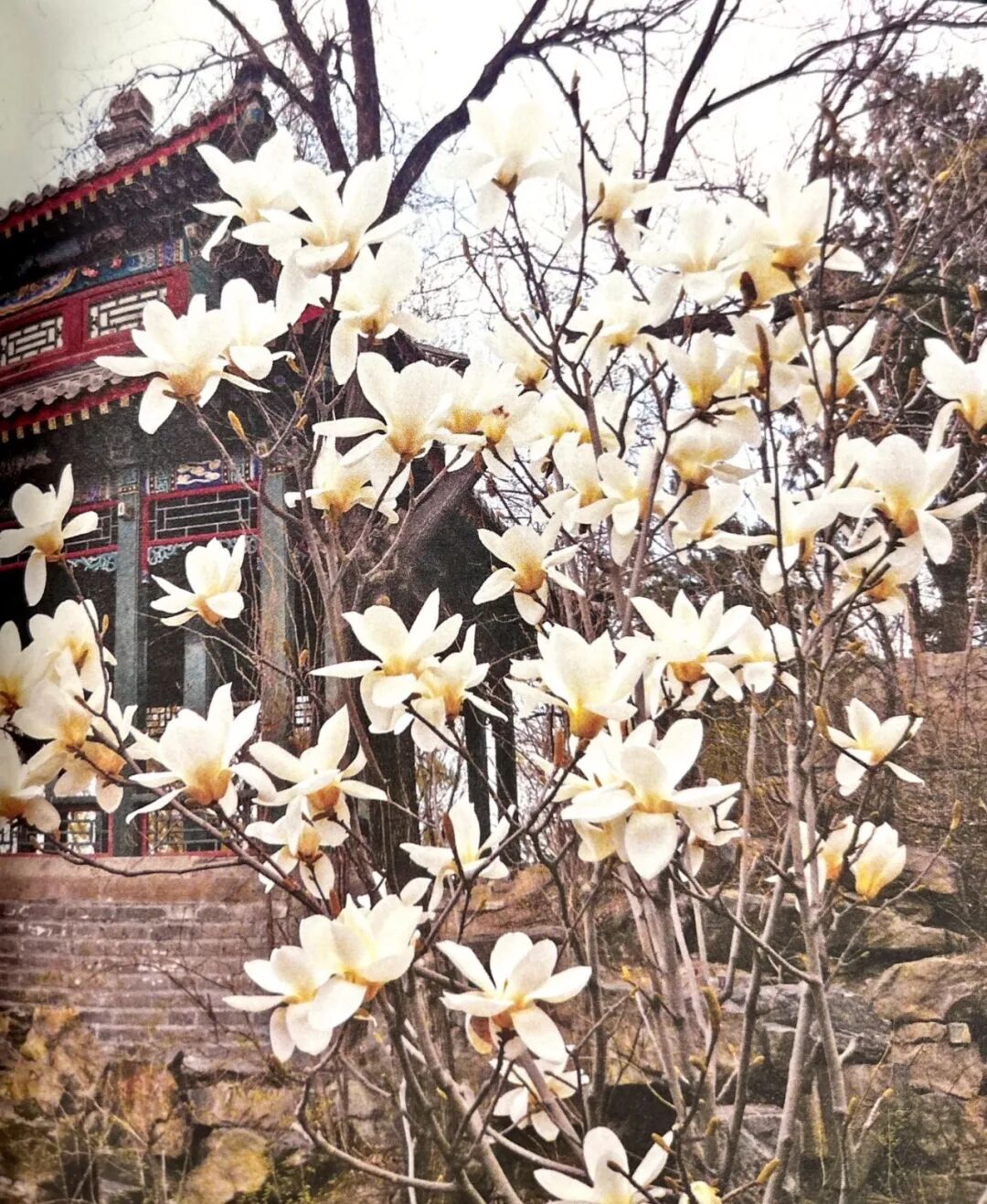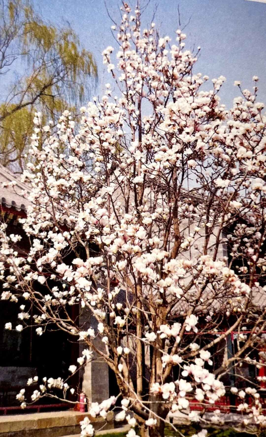 落叶乔木,原产我国中部,现广泛栽培。冬芽大,密被灰色绒毛。单叶互生,倒卵形,全缘。花期4月初,花单生小枝顶端,先叶开放,大而美丽;花被9片,一般全为白色。聚合蓇葖果红色。著名观赏植物,图书馆南门外西边草地有两株;经济研究中心有两株花势最盛,校景亭西侧新近种了一株,长势很好;陈守仁国际研究中心西侧可能是一个杂交种。