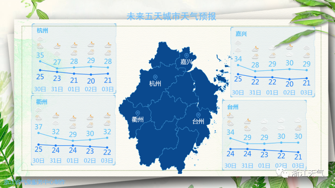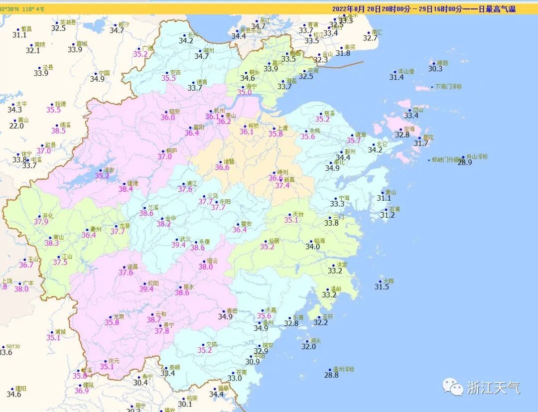 但在冷空气歇息之时,高温就会趁虚而入。今天高温反扑,截至16时,除了浙北北部和沿海地区,我省大部被高温笼罩,最热前三甲:松阳和武义均为39.4℃、云和38.7℃、丽水和永康均为38.6℃。