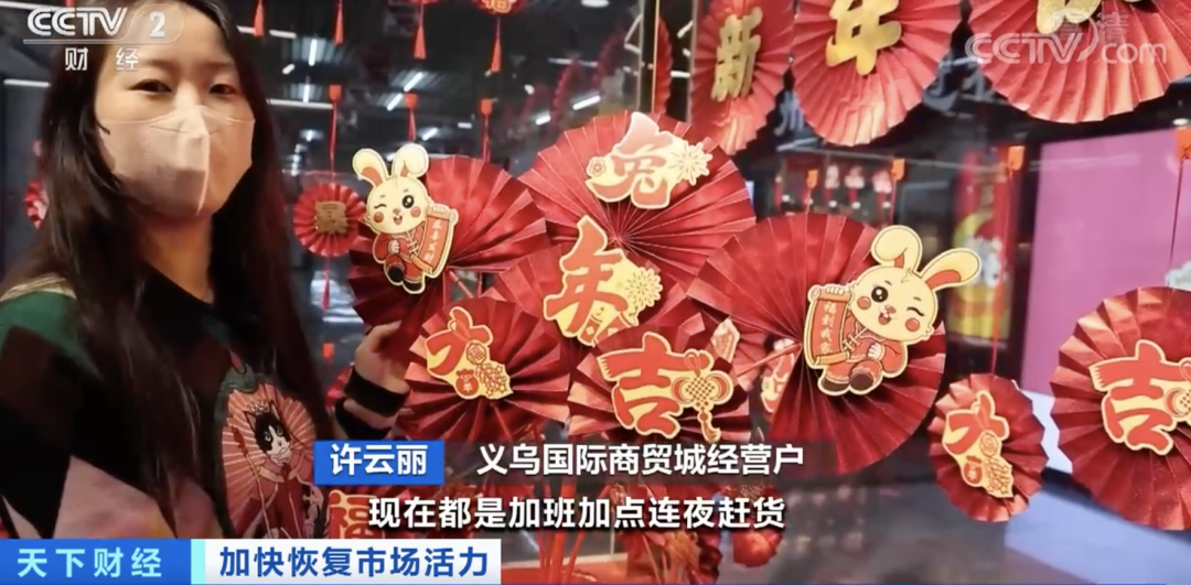 义乌国际商贸城经营户 周贤勇:有几个爆款还在赶货,今年的生意比往年还好,我今年的生产量比去年增加百分之二十。义乌国际商贸城经营户 许云丽:量走得非常大,物美价廉,现在都是加班加点连夜赶货,客户都是在催发货。这家工厂一天可以制作3000个灯笼,订单已经排到了年底,工厂一边备足原材料,一边忙着招人手。记者看到,一箱箱灯笼正被搬运上车,运往各个物流园区,发往全国各地。在义乌,不仅内销市场火热,外贸也开始回暖,阔别已久的外商陆续到来。三年前,受疫情影响,印度客商八万从中国返回印度,此后他和合作多年的经营户鲍月华变为云端“网友”,看样、洽谈都是在线上。印度采购商 八万:因为图片上面不能看大小,材料又不能看,所以一定要过来这里,可以下多一点订单。不一会儿,八万和鲍月华就签下了一笔20万元的订单。防疫政策调整,鲍月华明显感受到外商们的强劲需求,像八万这样的境外采购商,她每天能接待好几轮。义乌商贸城的五金商会还建立了信息交流群,一旦有人拿下订单,就会动员周边商户共同推介关联商品的销售。义乌市出入境管理数据显示,截至目前,义乌常驻外商超万人,已恢复到疫情前的七成。来源:央视财经