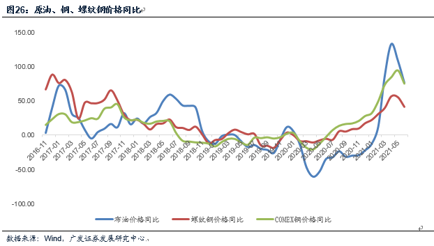 疫后经济和资产表现在一定意义上超出历史经验。去年下半年我们曾预测2021年将会有“全球贸易共振”,但2021年上半年出口增速斜率上依然高于去年底乐观预期,1-5月的同比达40%。前4个月地产销售累计同比增速的48%也同样超预期,且非基数因素影响能够涵盖。大宗商品价格是另一高斜率变化的领域,截至6月11日,IPE布油、COMEX铜2021年上半年环比增长分别为40.3%、28.9%。CRB指数2021年上半年环比增长亦高达27.0%,且指数已创10年新高。