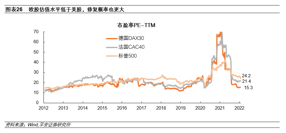 第二,从估值水平看,当前欧股估值处于相对合理水平。2021年以来,随着欧股企业盈利状况的修复,欧元区主要股指估值已逐渐恢复至疫情前水平。截至2022年1月24日,德国DAX30和法国CAC40指数的PE-TTM分别为15.3倍和21.4倍,分别处于近十年历史分位的22%和56%;对比美股,同期标普500指数的PE-TTM为24.2倍,处于近十年历史分位的78%。比较市盈率倍数和历史分位水平,欧股的估值水平低于美股、估值修复的概率也更大(图表26)。