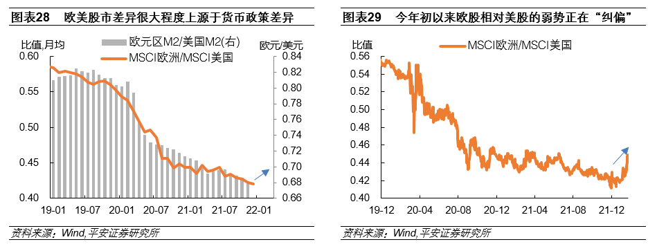 第三,从流动性角度看,欧央行货币政策相较美联储宽松,欧股有望跑赢美股及其他发达市场。新冠疫情以来,美联储货币政策比欧央行更加激进,在很大程度上造就了美股相对于欧股的强势。欧美M2比值的降幅与MSCI欧洲与MSCI美国指数比值的降幅相当(图表28)。如前文所判断,欧元区通胀率或在随着能源品价格触顶回落而走低,且欧央行在2021年7月宣布了“对称2%”的通胀目标,对通胀暂时超调给予更多容忍,再加上意大利等欧盟成员的政府债务风险,使欧央行在削减资产购买的过程中更受束缚,预计欧央行在2022年货币政策将维持相对宽松。在美联储多次加息乃至缩表的背景下,2022年欧美货币流动性将呈现“松紧差”,欧美M2比值有望明显回升,从而带动欧股跑赢美股。事实上,2022年以来,随着美股在美联储紧缩预期中出现明显调整,欧股韧性已经开始体现,新冠疫情以来欧股的相对弱势有望继续“纠偏”(图表29)。
