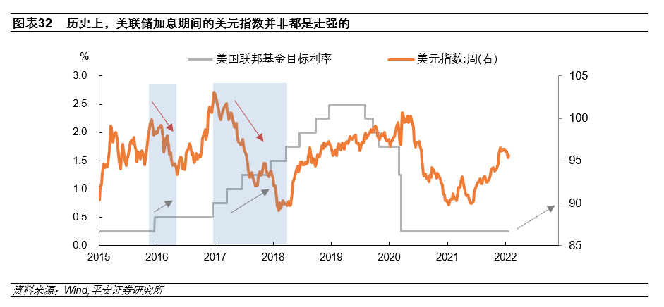 不过,我们也提示2022年欧元汇率企稳(甚至反转)的机会:一方面,回顾2015年以来,美联储加息期间的美元指数并非都是走强的。例如,2015年底至2016年中,以及2017年全年,美元指数均明显回落。如果市场对美联储加息已有充分预期,且美联储紧缩过程中或引发美国经济相对走弱,那么美元汇率可能在美联储加息的同时走弱。2022年,随着全球经济继续迈向复苏,美国经济“一枝独秀”的程度减弱,美元指数上行空间已然受限;而通胀压力下的美联储紧缩节奏较快,不排除对美国经济造成明显的负面冲击,继而美元指数可能调头转弱。
