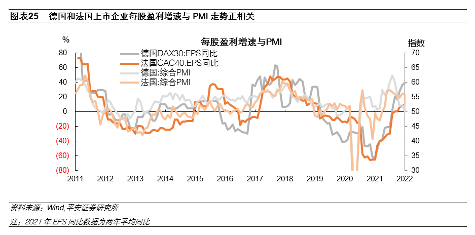 第一,从盈利角度看,欧元区经济仍处复苏阶段,经济基本面将继续带动企业盈利修复。2020年新冠疫情爆发后,欧股盈利状况迅速恶化,德国DAX30和法国CAC40指数当季EPS同比增速在2021年一季度降至低点。此后,欧股盈利状况迅速改善并转为正增长:截至2021年四季度,德国DAX30和法国CAC40当季EPS两年平均同比增速分别为38.6%和8.7%。观察近十年数据,德国和法国上市企业每股盈利增速与PMI走势正相关(图表25)。在欧元区经济复苏空间充足的背景下,预计欧股盈利增长也仍有空间。截至2022年1月24日,彭博统计的市场对于德国DAX30和法国CAC40未来12个月EPS同比增速的一致预期分别为6.4%和47.9%。