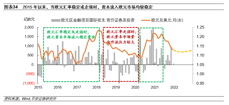 若欧元汇率贬值压力不大,则欧元区资金流出压力可控,以美元计价的欧元区股票也有望在相对稳定的汇率中保值。2015年以来,当欧元汇率稳定或走强时,资金流入欧元市场均较为稳定;只有当欧元汇率处于一年以上的贬值周期时,市场对欧元资产的投资才会显得消极,资金流出欧元市场的压力才会加大(图表34)。总结而言,2022年欧元汇率贬值压力有限,或难稀释配置欧元资产的投资回报。