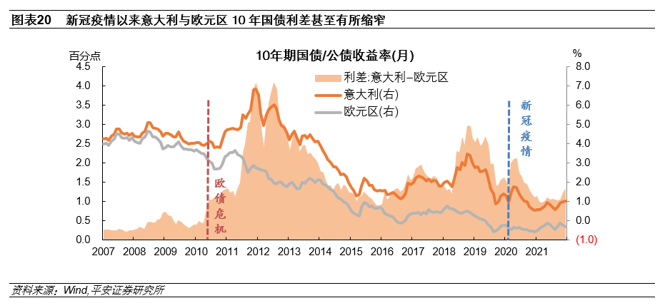 因此,2020年下半年以来,尽管意大利财政状况不够健康,但意大利政府仍能以非常优惠的条件进入国际资本市场,意大利国债收益率并未显著高出其他欧洲债券,新冠疫情以来意大利与欧元区10年国债利差甚至有所缩窄(图表20)。