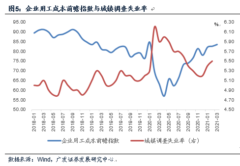 从历史数据看,用工成本和调查失业率之间整体呈经验负相关关系。这在逻辑上也很容易理解,用工成本高,意味着劳动力存在缺口,一般对应就业情况不错。