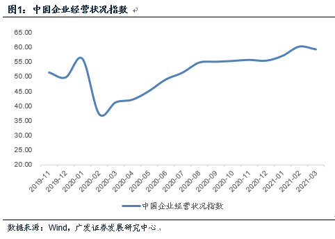 中国企业经营状况指数终值为59.4,低于2月的60.3,但高于2月之前的最高值57.2。这一指标自2020年3月回升以来整体趋势性上行,而当前出现了高位徘徊的特征。