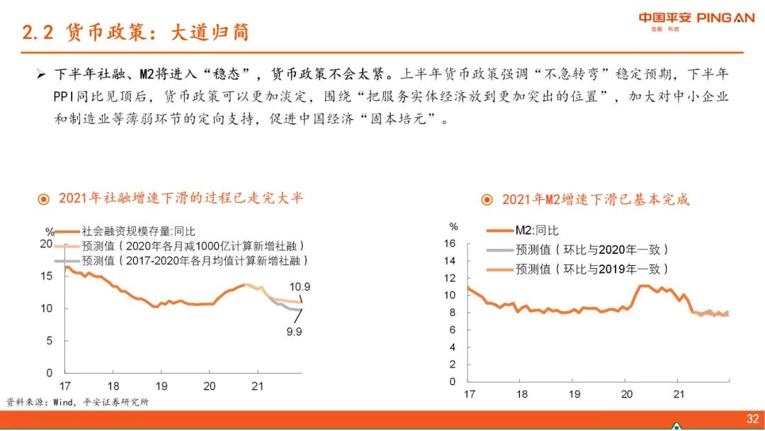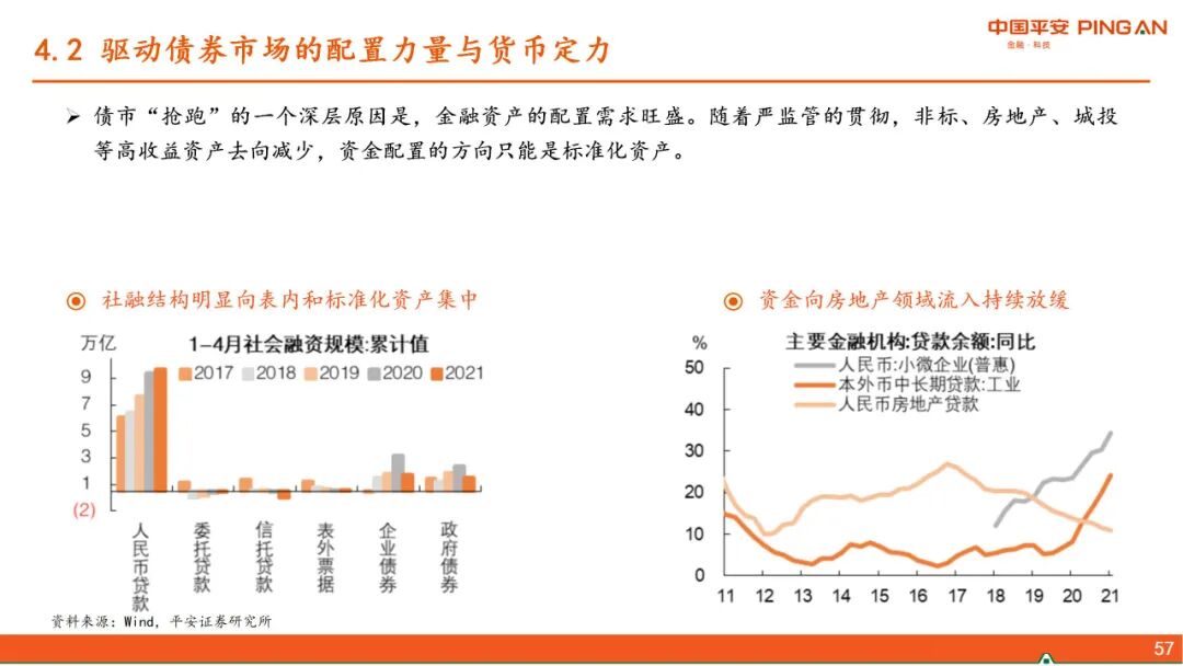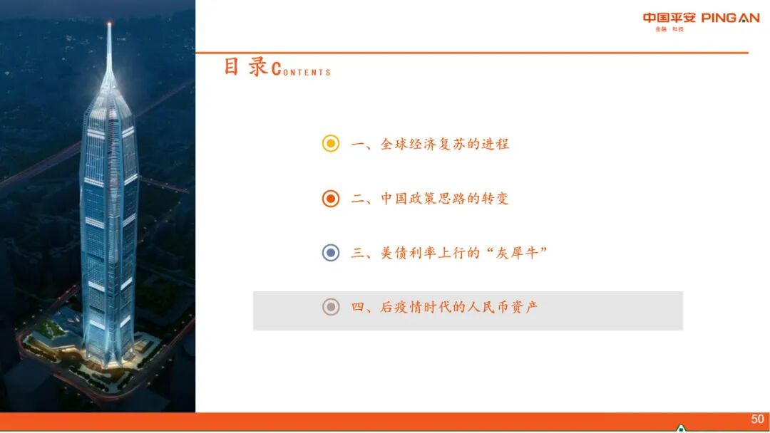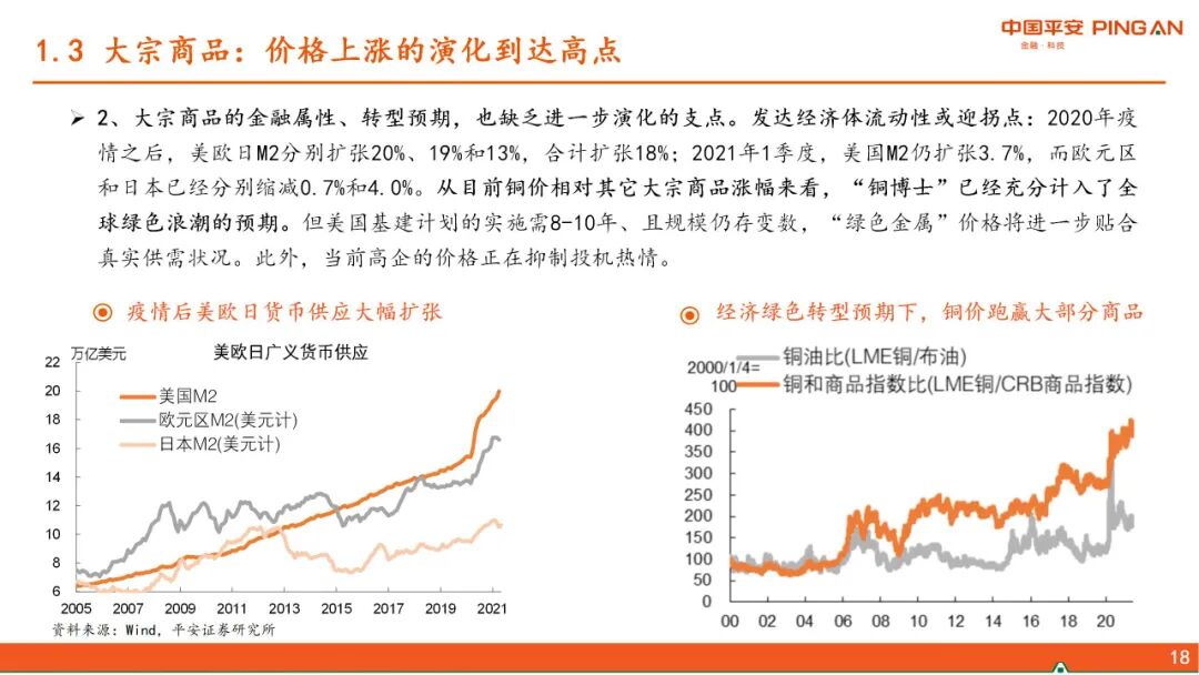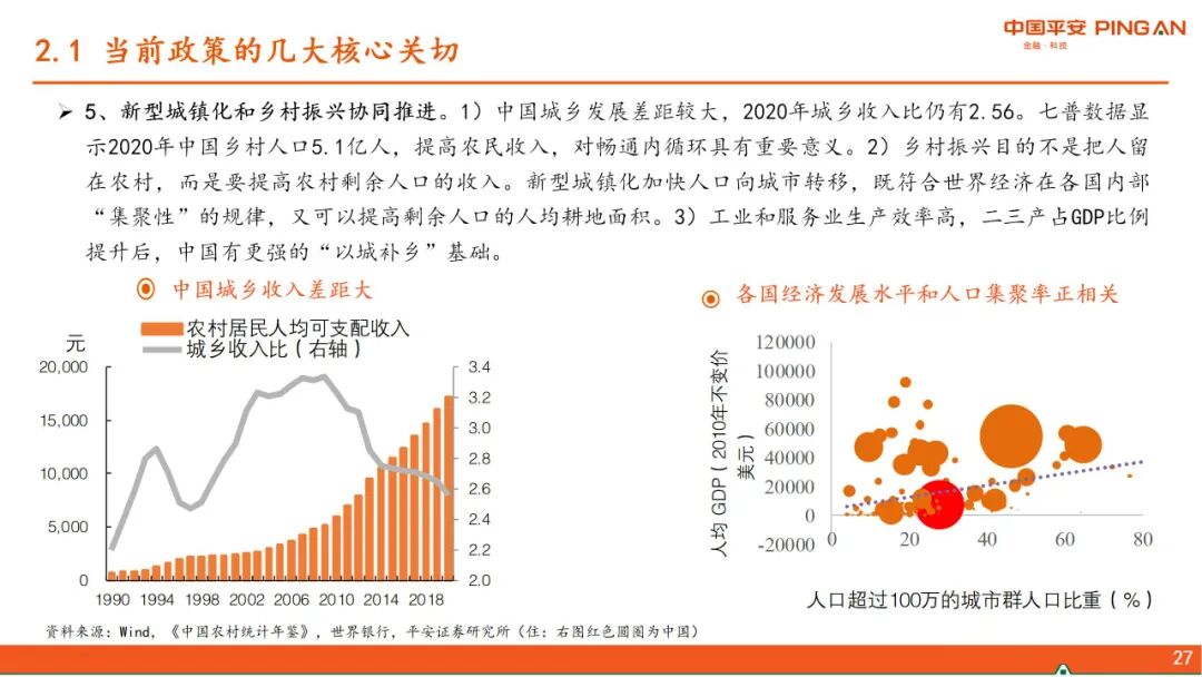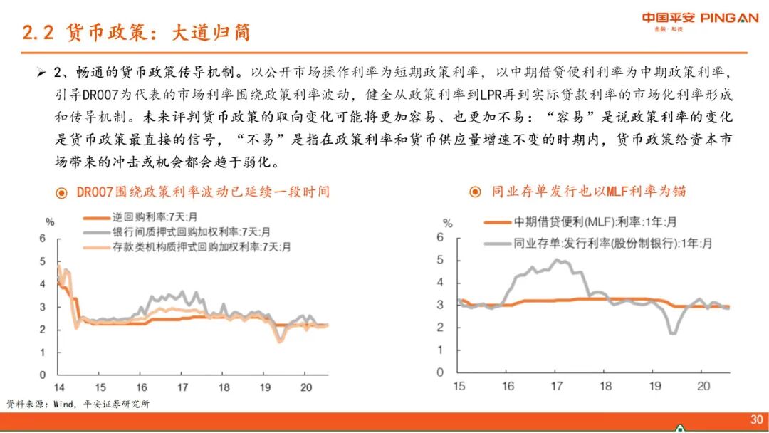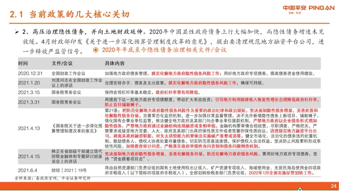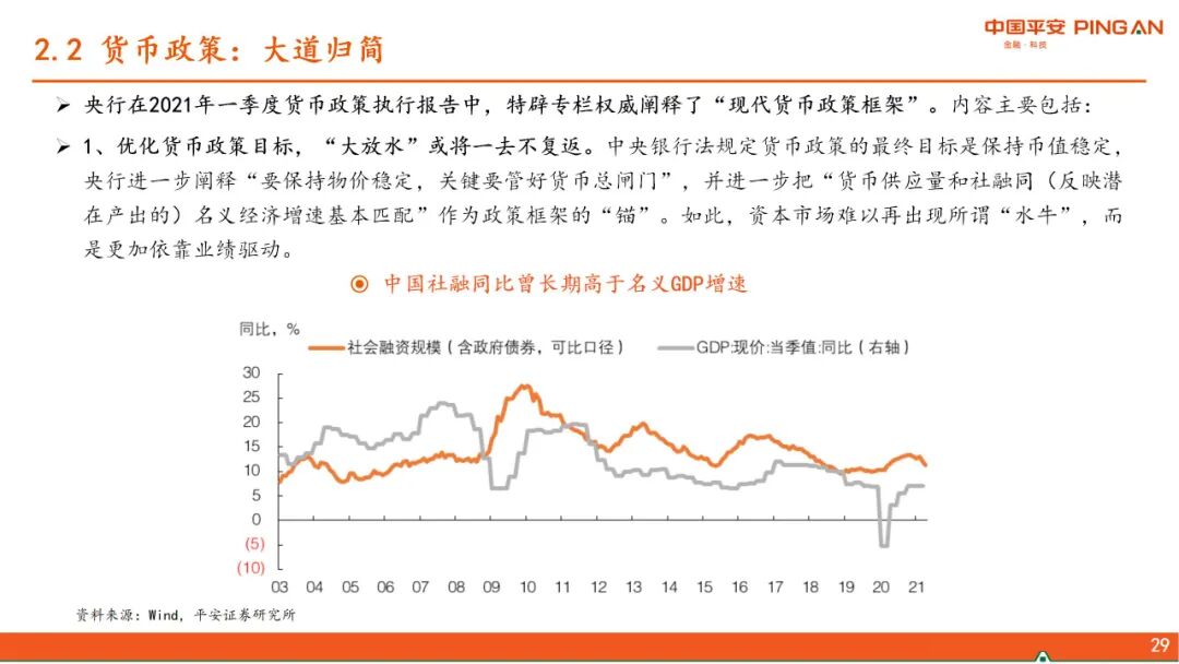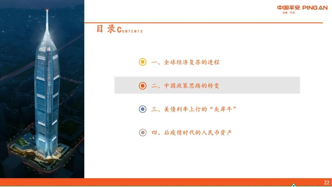 二、 中国政策思路的转变。当前政策的几大核心关切:1、“碳达峰、碳中和”,更加注重政策推进对大宗商品价格的影响。2、高压治理隐性债务。3、从房企、金融机构、地方政府和限购等层面形成政策合力,减轻经济发展和房地产的捆绑。4、应对人口快速老龄化,解决低生育率问题。5、新型城镇化和乡村振兴协同推进。6、科技自立自强。在以上政策大方向下,货币政策大道归简,财政政策增量基建的空间缩窄。