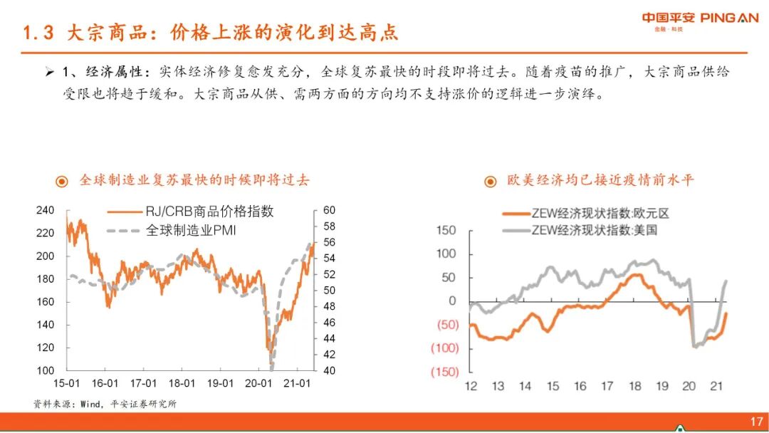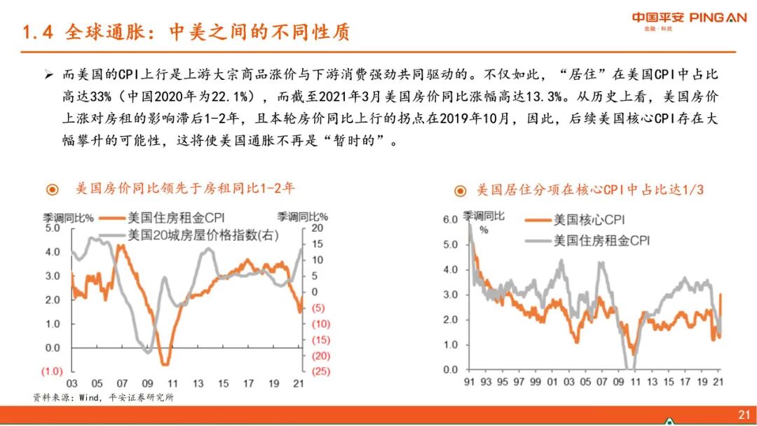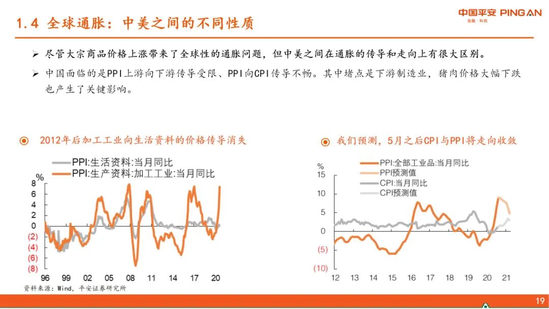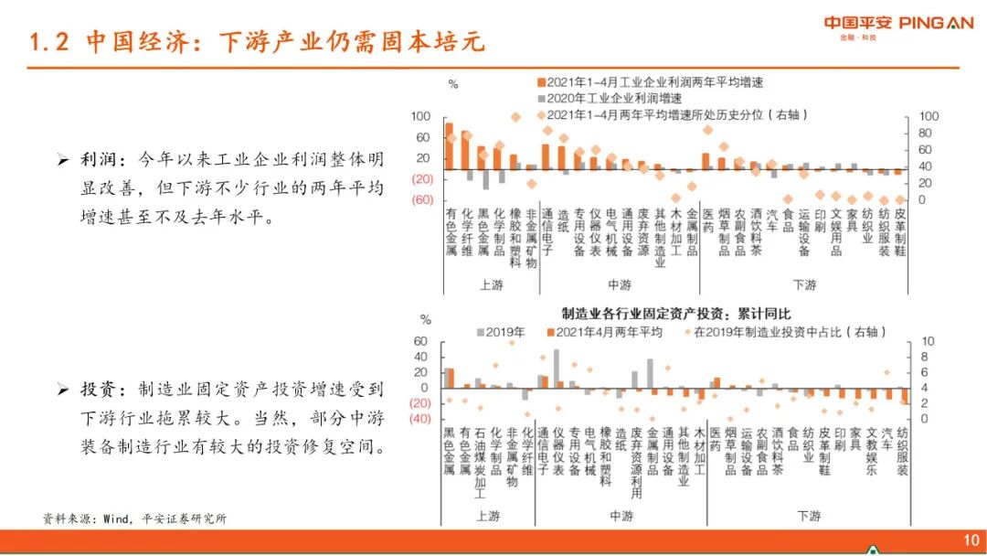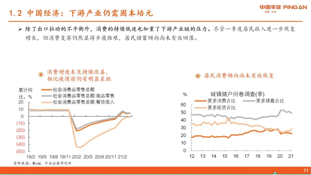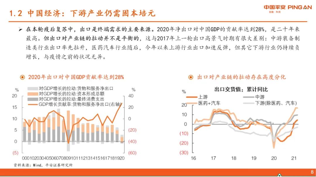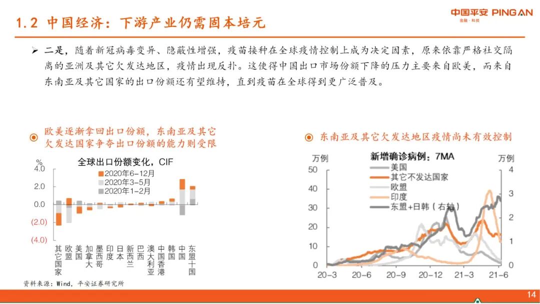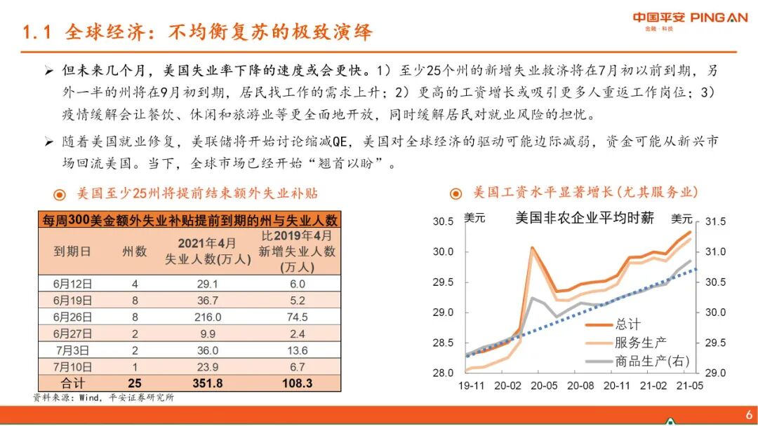 一、 全球经济复苏的进程。本轮疫后全球复苏的特点是强劲但不均衡,美国财政发力导致超强消费vs不愿就业,从而暂时形成“快通胀、慢就业”的局面,并对全球经济产生了外溢效果。随着美国财政补贴陆续到期及就业修复,上述逻辑将发生变化。当前中国经济复苏存在“高低脚”,下游产业仍需固本培元。随着出口对中国经济的拉动逐渐减弱,下半年中国经济的方向将是“见顶巩固”,经济增长的结构分化收敛。