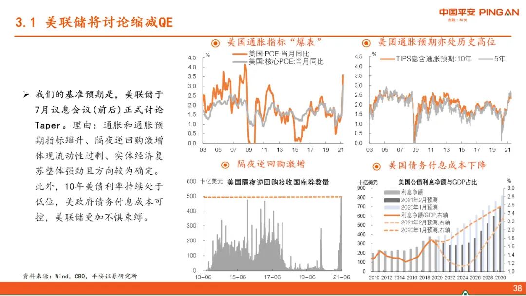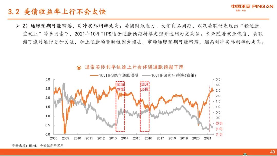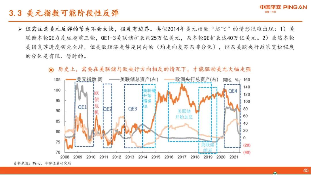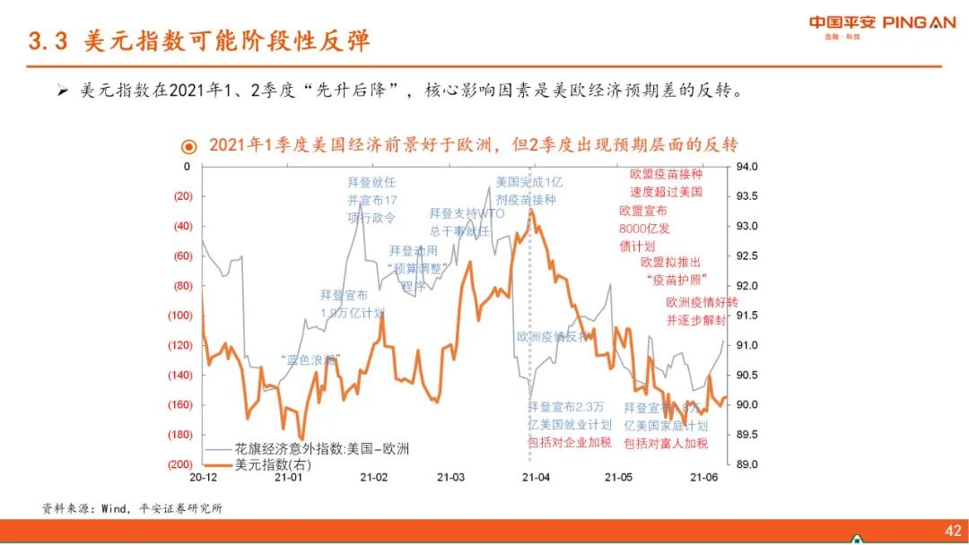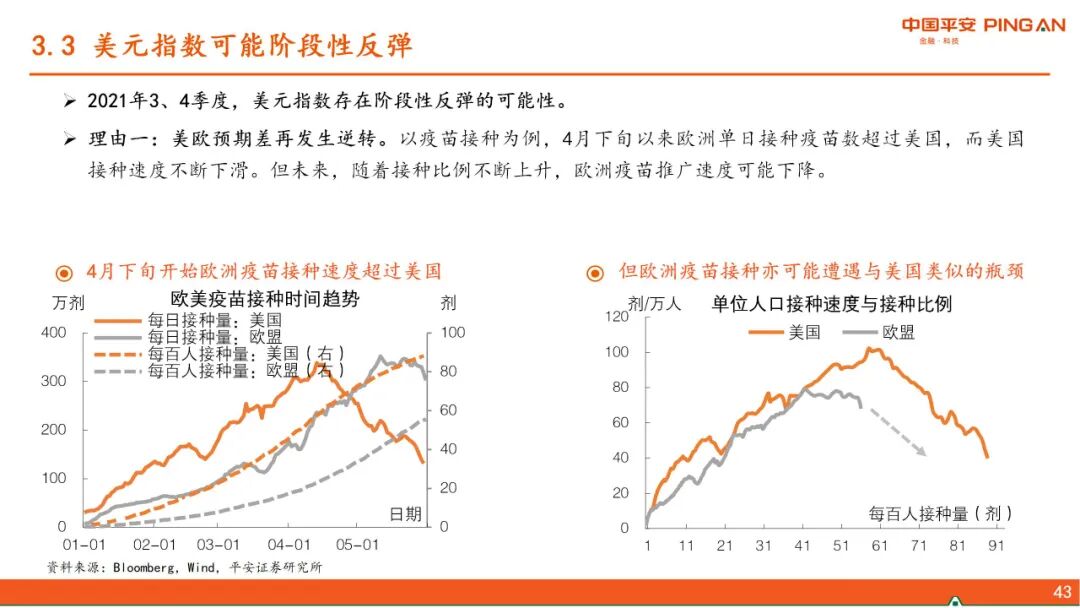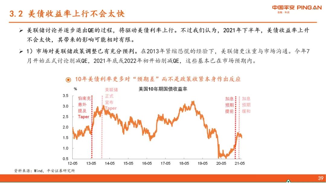 三、 美债利率上行的“灰犀牛”。下半年美联储将讨论并逐步退出QE,但我们认为在此过程中,美债收益率上升不会太快。美元指数存在阶段性反弹的动能,但强度亦有边界,对新兴市场、尤其中国的影响可控。中国货币政策可以“以我为主”。