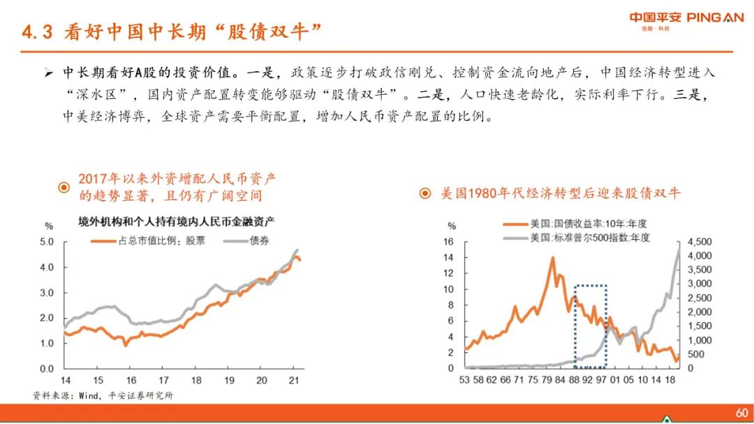 四、 后疫情时代的人民币资产。人民币汇率短期会随着美元指数的强弱变化而呈现波动,但人民币汇率的长期走向取决于对中国经济、对人民币资产的信心。在政策高瞻远瞩之下,看好人民币资产和人民币升值趋势。政策打破政信刚兑、控制资金流向地产后,国内资产配置的转变能够驱动“股债双牛”,同时中美经济走向“脱钩”,全球资产需要两边平衡配置,增加人民币资产配置的比例。