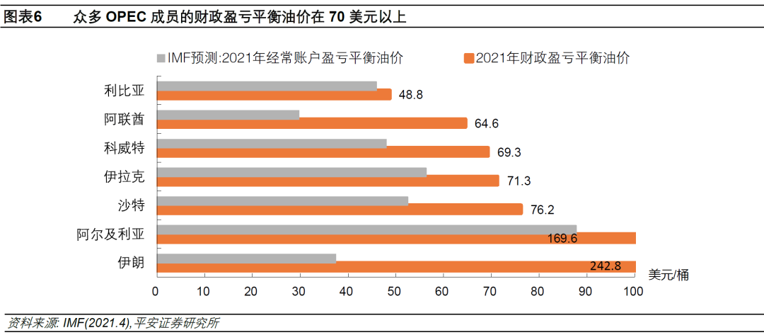 需要注意的是,OPEC成员目前仍然拥有充足的“闲置产能”(EIA将其定义为30天内可投产并至少持续90天的产量),客观上具备较强的生产调节能力。而目前OPEC维持较为克制的增产计划,主要原因或在于:一是,其对新冠疫情后全球石油需求的看法偏悲观;二是,因此前伊核协议谈判持续进行,伊朗石油有望重回市场;三是,与美国油企的态度类似,中东国家也看重“利润率”,希望在较高的油价下修补财政赤字。据IMF估算,对众多OPEC成员国而言,当前的油价虽然已经足够平衡其经常帐赤字,但平衡财政赤字仍需要油价维持在70美元/桶以上(图表6)。在这些背景下,OPEC+认为小幅、高频地增产,更有助于降低因供应过剩导致油价崩塌的风险。
