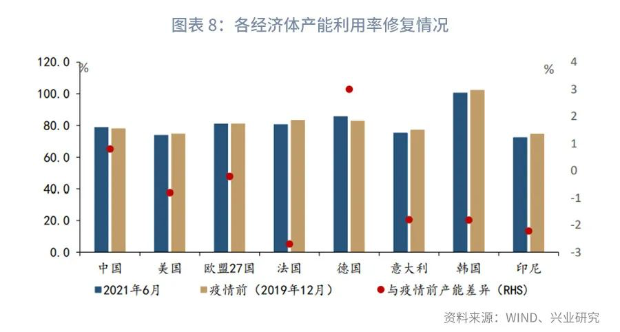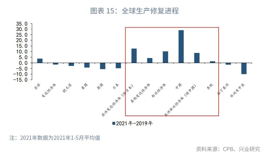 得益于市场份额超预期上行,2021年上半年出口超预期增长38.6%。出口份额稳固与否,关系到我国出口走势的判断。出口份额的另一面是各国生产修复能力,数据显示生产能力修复越高的经济体,其出口市场份额上升越高,参见图表14。因此,我们可通过判断主要经济体生产能力修复进程来判断我国出口份额。