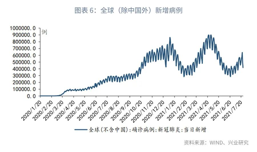 第一,从外力看,海外疫情反复既稳定了防疫物资需求也抑制了海外供给修复。一方面,疫情期间,防疫物资出口市场份额普遍上升,防护服、口罩、红外线测温仪、外科手套等出口市场份额上升份额均在20%以上,参见图表5。后疫情时期,市场普遍预期伴随疫苗广泛接种,我国防疫物资出口市场份额或现回落。然而事实却是,病毒变异叠加疫苗接种不均衡,2021年全球新增病例不减反增,且新增病例峰值超出2020年,参见图表6。在稳定增长的市场需求支撑下,我国防疫物资出口份额保持基本稳定。以对美国出口为例,除护目镜外,多数防疫物资对美出口市场份额上升,参见图表7。