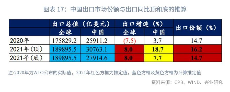 假定WTO统计口径下份额变动与CPB口径一致,那么2021年WTO统计口径下的出口份额的底和顶分别为14.7%和16.2%。2021年3月31日,WTO发布报告《全球贸易数据与展望》预测2021年全球货物贸易将增长8.0%。在此假设下,推算出2021年我国出口同比底和顶分别为7.7%和18.7%,参见图表17。