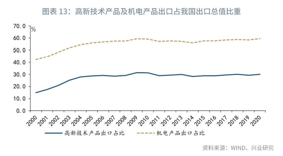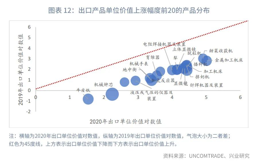 战后美国出口份额维持高位,暗示其在战时积累的产品竞争优势并没有随战争的结束而消失。同样,疫情期间我国出口产品竞争力上升不仅表现为市场份额上升,同时也表现为产品单位价值上升。一般而言,出口产品单位价值上升意味着一单位商品获得价值回报上升,是产品竞争力上升重要表现。在疫情期间,2295个产品单位价值上升,占总样本比重接近55.0%,多数产品实现了出口单位价值提升,参见图表11;同时,从单位价值提升幅度靠前的产品看,多数集中在技术复杂度更高的机电产品,参见图表12。同步于出口单位价值提升,2020年我国高新技术产品和机电产品出口占我国整体出口比重进一步抬升,分别较2019年抬升0.8和1.1个百分点,出口产品结构有所改善,参见图表13。