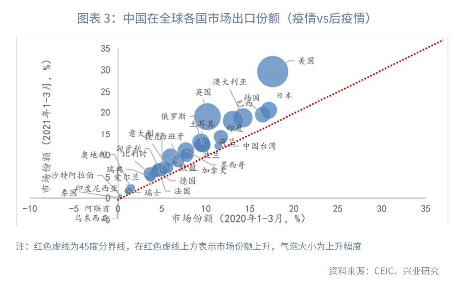 分出口目的地看,2021年上半年市场份额的上升具有普遍性。数据观察显示,相比于2020年1-3月,我国出口在主要经济体市场份额均有所上抬,上升份额在0-12.0百分点不等,参见图表3。其中,在美国市场份额上升较为明显,上升了12.0个百分点至32.1%。