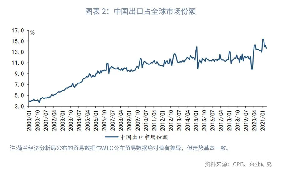此前,市场普遍预期疫情推升的我国出口份额可能具有暂时性;伴随疫情对全球贸易的影响弱化,我国出口市场份额也将弱化。然而,荷兰经济研究局数据显示,2021年市场份额不仅没有弱化,反而强于去年同期。具体表现在:疫情爆发以来的出口市场份额单月峰值出现在2021年2月,创下15.4%的历史记录;同时,2021年1-5月出口市场份额稳定在13.6以上的水平,高于去年12.8%的均值,参见图表2。