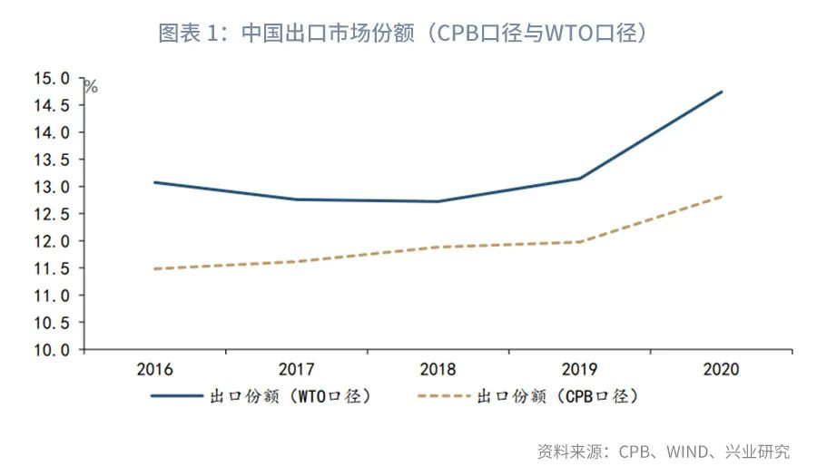 2020年新冠疫情爆发以来,我国出口逆势上扬,出口占全球的份额录得有数据记录以来的最高值。在不同统计口径下,我国出口份额绝对水平不一但节奏一致,参见图表1。目前,市场较为关注的为WTO统计口径的出口份额。考虑到目前WTO公布的月度数据样本不全,可能会带来分析偏差,本文选用荷兰经济分析局(CPB)公布的全球出口样本数据进行观察。