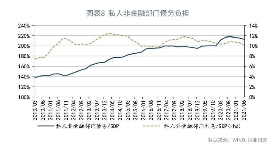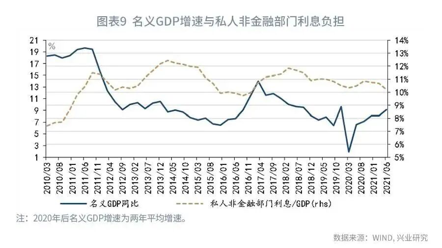 通过对付息支出的分析,我们可以得到货币政策两个重要的风向标。第一,私人非金融部门利息与名义GDP之比。自2011年起,每当经济出现下行压力时,融资成本往往会出现下降,将私人非金融部门利息与名义GDP之比引导至10%一线附近。2021年第二季度,这一指标已下降至10.2%。考虑到未来名义GDP增长可能出现放缓,可能需要进一步降低融资成本,将付息负担维持在较低的水平。