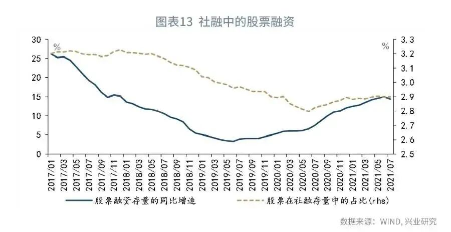 第二,发展股权融资有助于减轻债务压力。2020年下半年以来,我国股票融资增长较快,但在社融中的占比依然偏低。2021年7月股票在社融存量中的占比为2.9%,股票融资存量的同比增速为14.4%,据此推算,其对社融增长的拉动在0.4个百分点左右。如果我们希望在降低债务融资增速的同时保持实体经济获得的资金支持相对稳定,则需要大力发展股权融资,提高股权融资对整体社融的拉动。