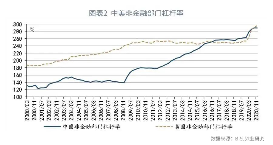 如果在同一个经济体内进行纵向比较,我们会发现:2008年美国陷入债务危机时,其非金融部门杠杆率达到240.2%(参见图表2);在一系列刺激政策作用下,美国逐渐走出了债务危机的影响,在此过程中非金融部门的杠杆率是稳中有升的,没有出现所谓的“去杠杆”,到2020年美国非金融部门杠杆率已进一步上升到了296.1%,债务危机却没有再度上演。