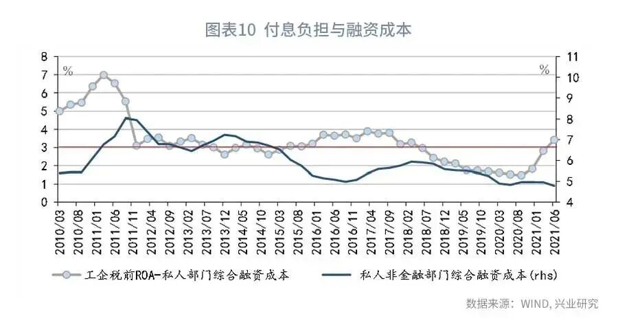 第二,工业企业税前ROA与私人非金融部门融资成本之差。工业企业税前ROA通常要高于私人非金融部门综合融资成本,一旦二者之差收缩到较低的水平,则表明融资成本偏高,可能引发货币政策调整。