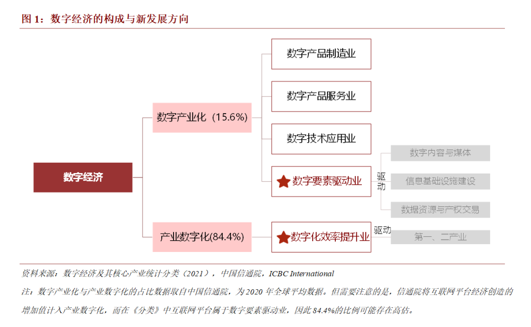 由此,我们的核心判断是,2022年全球数字经济的发展重心将聚焦于数字要素驱动业与数字化效率提升业。其中,数字要素驱动业的投资机会将诞生于数字内容与媒体,一方面新型信息基础设施建设为数字内容的创建提供了生产力的技术保证,另一方面数据资源与产权交易则为数字内容的交换与变现塑造了有序的生产关系,生产力与生产关系的共振将孕育出数字内容广阔的市场空间。而在数字化效率提升业中,由于数字经济与服务业业态的融合已经相对成熟,数字技术对农业、工业的全方位和全链条改造将成为核心驱动力。