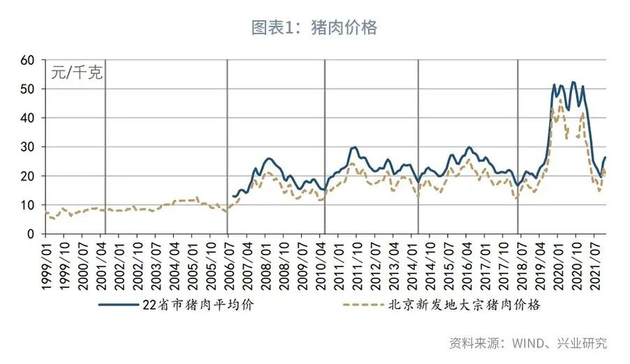 在工业品通胀压力逐渐减弱之际,市场开始将目光转向农产品。在过去,猪肉价格通常呈现3到4年的周期性波动。而自2018年5月猪肉价格见底至今已经44个月。展望2022年,新一轮猪周期是否会重新开启?本文将梳理猪周期的分析框架,并在此基础上探讨2022年猪肉价格走势。