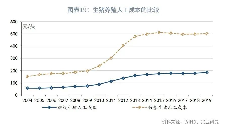 自2004年以来,生猪养殖成本呈现出波动上升的趋势,散养生猪的养殖成本持续高于规模生猪。散养生猪与规模生猪在饲料等方面的成本差异并不显著,但散养生猪的人工成本明显高于规模生猪。