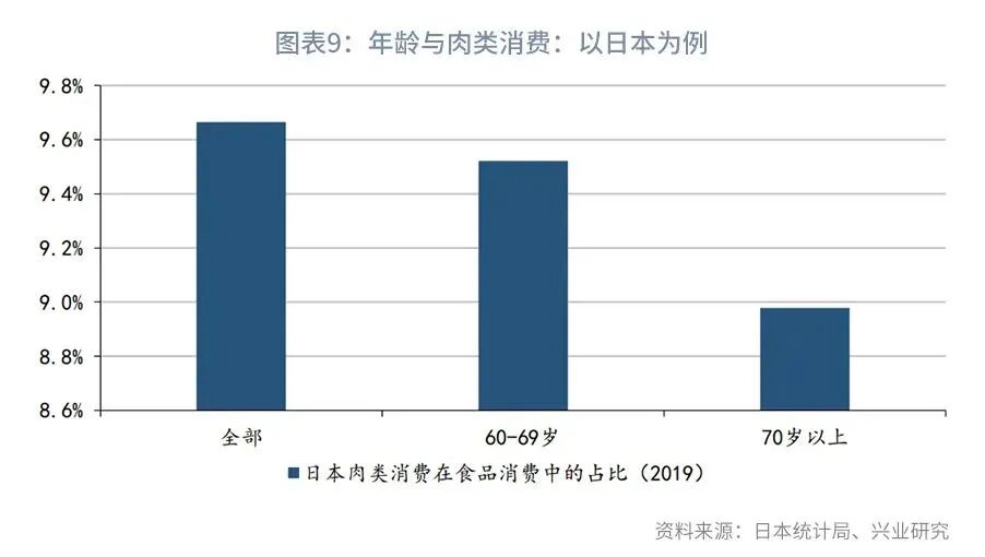 但是,通常与年轻人口相比,老年人口的肉类消费占比更低。从人口结构来看,我国15-64岁人口数量在2013年见顶,与猪肉消费量见顶的时间十分接近。日本的经验显示,老年人口的肉类消费少于年轻人口。2019年日本全部家庭肉类消费在食品消费中的占比为9.7%,户主60到69岁家庭的这一占比为9.5%,户主超过70岁的家庭的这一占比为9.0%。因此,人口老龄化可能是导致2014年后猪肉消费见顶回落的重要原因。