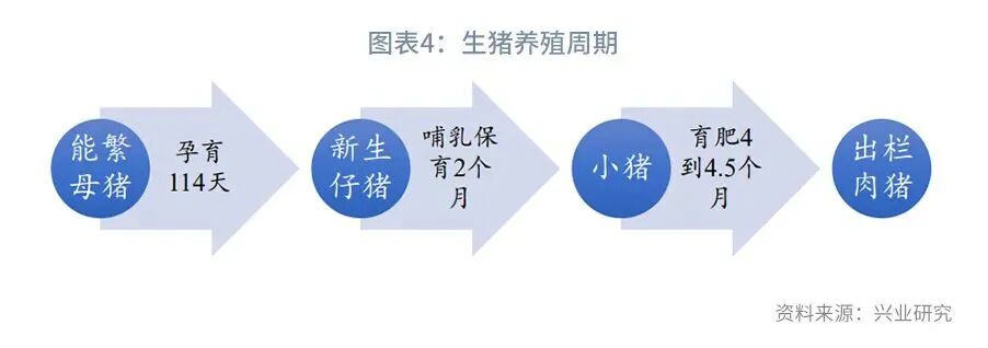人们通常认为,生猪特有的养殖周期是导致猪肉价格周期性变化的原因。能繁母猪孕育约114天后仔猪出生,仔猪哺乳保育2个月后开始育肥,育肥4到4.5个月后即可出栏。上述过程合计需要10个月左右的时间。