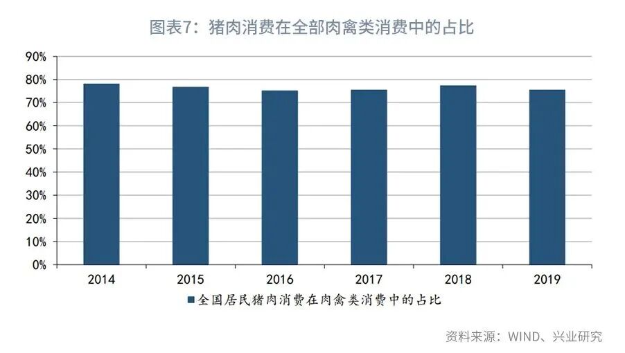 猪肉消费为什么会见顶回落?从猪肉消费在全部肉禽类消费中的占比来看,2014年以来我国猪肉消费在肉禽类消费中的占比稳定在76%左右。
