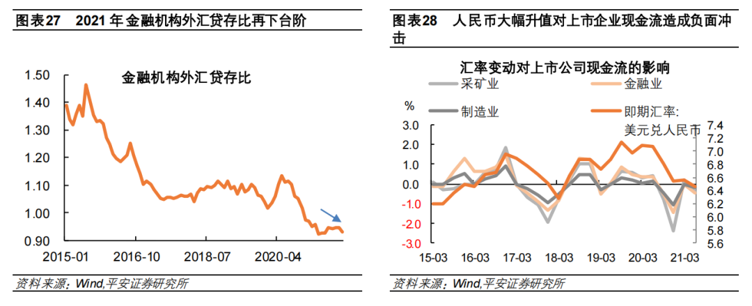 这意味着,2021年12月央行上调外汇存款准备金率的主要原因,可能在于人民币汇率所达到的点位触及了政策的心理关口,从而也意味着如果人民币汇率进一步走升,后续不排除更多政策工具的使用。央行两次上调外汇存款准备金率时,美元兑人民币汇率都位于6.35附近(2021年5月31日美元兑人民币中间价为6.3682,12月9日为6.3498)。2021年11月举行的全国外汇市场自律机制第八次工作会议指出,人民币汇率未来“双向波动是常态,合理均衡是目标,偏离程度与纠偏力量成正比”。2021年12月“纠偏力量”的出现,说明人民币汇率与基本面的偏离程度或已超出“合理均衡”的范围。而人民币汇率过度升值会对外向型企业造成不利影响,在2022年我国出口面临增速下行时,这种不利影响可能凸显出来。观察A股上市公司现金流量表中的“汇率变动对现金的影响”可以发现,人民币对美元汇率大幅升值会对采矿业、制造业、金融业等几个大类行业的现金流产生负面冲击。