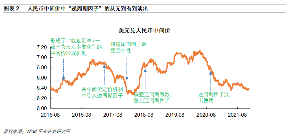 人民币中间价形成机制从“三因素”回到“两因素”。2015年“811汇改”,奠定了人民币汇率中间价与“上日收盘汇率”挂钩的形成机制,以反映市场供求变化。后因贬值压力过快释放,2015年12 月11日起加入了参考“一篮子货币汇率变化”,以更好保持人民币汇率的基本稳定。2017年5月26日,央行宣布引入“逆周期调节因子”,以适度对冲市场情绪的顺周期波动,由此形成了人民币兑美元汇率中间价“收盘汇率+一篮子货币汇率变化+逆周期因子”的三因素定价机制。此后,由于人民币升、贬值预期的扭转变化,又经历了“逆周期因子调整至中性”(2018年1月9日人民币升值预期汹涌)、“重启逆周期因子”(2018年8月24日中美冲突导致人民币贬值接近破7)、“逆周期因子淡出使用”(2020年10月27日人民币从贬值预期转为升值预期)。至此,人民币中间价形成机制基本回到了“收盘汇率+一篮子货币汇率变化”的两因素框架。