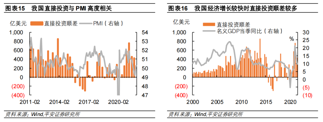 直接投资流入与经济增长状况密切相关。在资本与金融账户中,直接投资代表长期的资本流动,外商直接投资(FDI)与对外直接投资(ODI)之差形成了国际收支中的直接投资差额。因此,直接投资顺差的增长说明国际资本对我国长期经济增长较为乐观。这从PMI、名义GDP增速与直接投资顺差的相关性上可以印证这一点,即当我国经济增长加快时,直接投资顺差也处于高位。新冠疫情后,由于我国经济率先复苏,外资对中国经济的信心也迅速恢复,直接投资差额由2020年二季度的47亿美元,升至2021年一季度的757亿美元,创下历史第二高的记录。往后看,我国已经过了疫情后复苏最快的阶段,2022年经济增长将步入常态化,未来直接投资的高额顺差也将趋于回落。