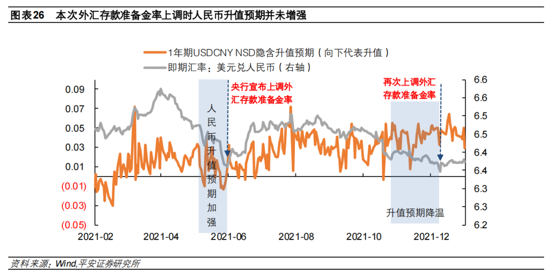2021年央行两次上调外汇存款准备金率的背景是,外汇存款相比于外汇贷款需求增长过快。银行外汇贷存比由2020年10月的1.05进一步下台阶至2021年11月的0.93,说明有较多的外汇流动性淤积在境内商业银行体系内,形成了宽松的美元流动性,为人民币汇率带来了升值压力。上调外汇存款准备金率可多锁定一部分美元流动性。不过,两次上调外汇存款准备金率时,人民币汇率的升值预期集中度并不相同。我们以扣除中美利差影响的一年期USDCNY NDF衡量远期汇率隐含的人民币升值预期,可见,2021年6月是在人民币升值预期显著上升的背景下采取调控政策;而2021年12月人民币升值过程中并未伴随升值预期的上升(相反升值预期还较前期有所下降)。