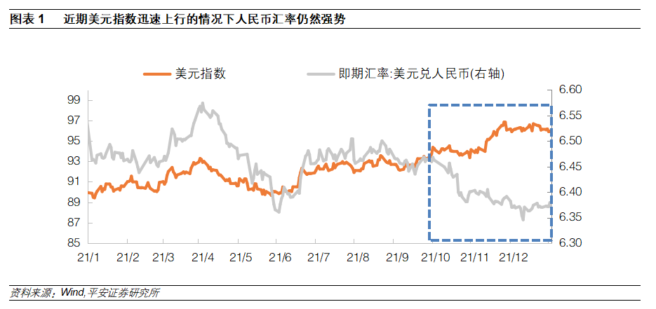 2021年11月初以来,伴随美联储加息预期快速升温,美元指数迎来新一波上行:11月1日至12月31日,美元指数由93.87升至95.97,期间更是一度接近97高位。但于此同时,美元兑人民币汇率却持续下挫:美元兑人民币汇率自10月以来从6.4626一路走低,到12月9日跌至6.3498低点,突破了2018年以来新低,人民币汇率表现相当强势。12月9日当天,央行发布公告决定自2021年12月15日起将外汇存款准备金率由7%提高到9%,释放出不希望人民币汇率过强的政策信号,美元兑人民币汇率随之企稳。