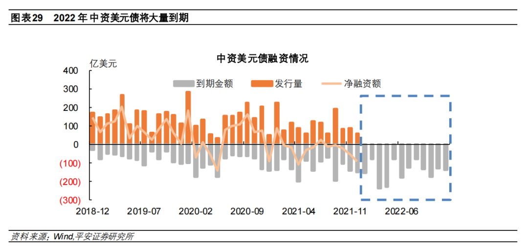 需要注意的一点是,2022年中资美元债的大量到期也会对国际收支差额产生影响。根据中资美元债发行流程,海外发债募集资金主要通过两个渠道回到国内:一是自身经营范围内的经常项下支出,二是资本项下的债权投资和股权投资,二者均会影响我国的国际收支状况。2022年我国中资美元债到期量达到1731亿美元,占中资美元债存量(截至2021年12月31日)的18.4%,而2021年以来中资美元债在海外募资愈发困难(2021年全年中资美元债共募集资金1292亿美元,较2020年下降24.8%)。在此情形下,2022年中资美元债的净融资金额可能继续下降,进而带来资金的净流出。并且,如果2022年人民币汇率出现阶段性贬值,则国内企业以美元计价的中资美元债的实际融资成本将上升,而中资美元债的融资主体又以处境艰难的房企居多,这可能成为压倒部分房企的“最后一根稻草”,进而带来海外融资进一步恶化的负循环。