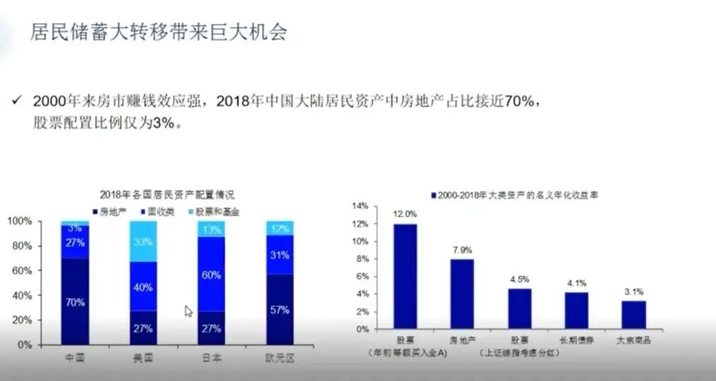 从居民家庭资产配置来看,中国居民家家庭资产70%配置都是楼市,对股市的配置不到3%。而在美国配置楼市的比例只有27%,配置股票和基金的比例高达33%,和中国刚好是反过来的。
